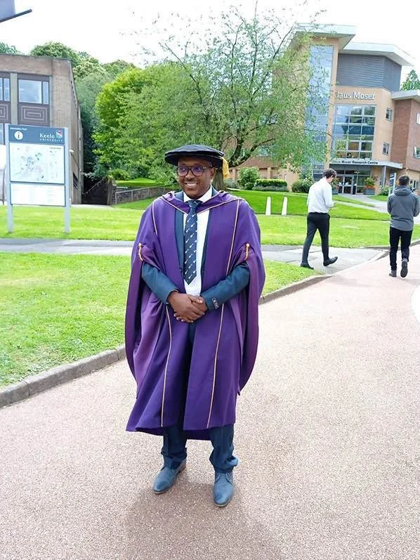 Godefroid in his higher doctorate gown attire, Keele University, 2023