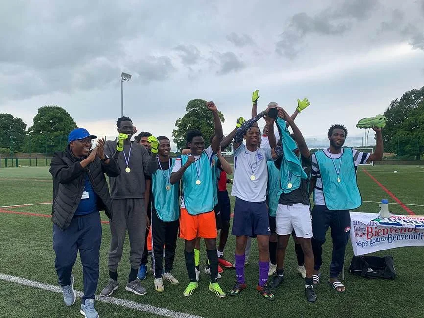 Asha football team winning the Derby Refugee Week Football Tournament, 2025